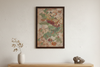 This striking framed panel is a magnificent vintage artwork executed in the challenging and specialized Fresco Style, utilizing pigment painted directly onto a plaster or thick, textured compound. This technique intentionally evokes the grand scale and antiquity of ancient wall paintings from regions like China's Silk Road. The artwork is presented as an organic fragment, deliberately sculpted to show raw, torn, and irregular edges, emphasizing the material's fragility and age. The painting itself features vibrant botanical and aquatic motifs (stylized lotus flowers), creating a flowing, ethereal composition where the saturated colors contrast beautifully against the distressed, earthy background.