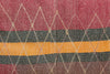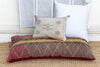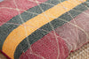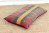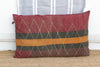 A rare find in a rectangular "lumbar" silhouette, this oversized floor cushion is crafted from an antique Saami Ralli quilt. The design features bold, horizontal color blocking in earthy tones of rust red, charcoal grey, and a striking band of mustard yellow. Overlaid on these stripes is an intricate geometric diamond pattern, hand-stitched in contrasting cream thread. The elongated shape makes it uniquely versatile—it can serve as a bench cushion, a floor lounger for two, or a substantial pillow for a deep sofa.