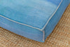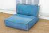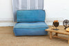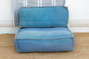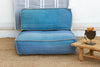 A casual, cool take on antique textiles, this floor seating set is wrapped in Antique Kantha with a rich spectrum of indigo and faded denim blues. The cotton is incredibly soft, worn-in to perfection like a favorite pair of vintage jeans. A unique detail on this piece is the side/back panel, which features a contrasting strip of intricate geometric tribal embroidery, adding a hidden layer of pattern to the solid blue expanses. Please note: The back cushion is unattached and free-standing; the set is designed to be placed against a wall for proper support.