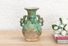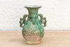 This highly ornate vessel is a dramatic piece of sculptural art, embodying myth and powerful symbolism. This antique Chinese vase, likely dating to the early to Mid 20th century, is characterized by its dramatic form and multi-toned glaze. The body features detailed, high-relief sculpting of mythical creatures or cloud motifs, while the neck is flanked by elaborate dragon or serpent handles. The thin, vibrant green glaze pools and runs down the surface, allowing the reddish-brown clay and sculpted details to show through, creating a unique, aged patina.