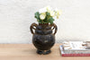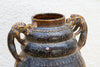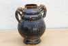 This commanding vessel is a powerful piece of sculptural history, a guardian of the ancient path. This antique Southeast Asian jar, likely dating to the 19th century, embodies a robust provincial aesthetic. The form is classic, with a rounded body elevated by a strong pedestal base. The piece is defined by its deep, rich black-brown glaze and the strong, high-relief sculpted handles in the form of mythical lion or dragon heads. Subtle, stamped decoration in horizontal bands adds a rhythmic texture around the shoulder. Originally a ceremonial vessel or storage jar for valuable liquids, its dignified form has endured. Measuring 9 inches wide and 10 inches high, this jar serves as a striking sculptural accent on a console or mantel, bringing a palpable sense of ancient history and protective symbolism to your interior.