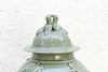 This magnificent, towering vessel is a masterpiece of sculpture and symbolism. This antique Chinese temple jar, measuring a substantial 10 inches wide and 17 inches high, likely dates to the late 19th or early 20th century and embodies the grandeur of imperial porcelain. The surface is adorned with intricate, high-relief sculpted dragons swirling amidst celestial clouds, powerful symbols of imperial authority and good fortune. The rich, pale celadon glaze is a classic and highly prized finish, adding a sense of elegant serenity to the dramatic form.