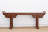 This exceptionally long antique Chinese altar console table is a masterpiece of fine carving and monumental design, a testament to a time when furniture was built to inspire reverence. Measuring a commanding 96 inches long, this table likely dates to the early 20th century, and its style and craftsmanship are hallmarks of the Late Qing Dynasty. Its powerful form, with a rich, reddish-brown patina, features a finely carved apron and legs adorned with mythical creatures and elaborate foliage, a narrative in wood that has endured for over a century.