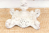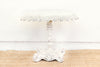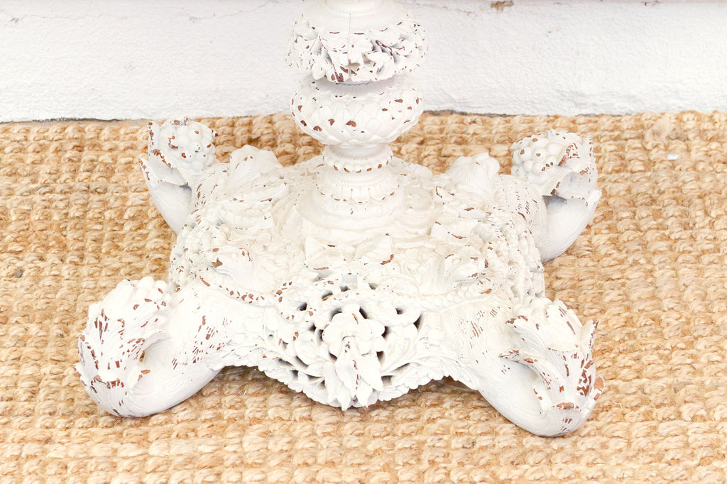 This finely carved  Anglo Indian oval table measuring 36 inches wide, 25 inches deep, and 29 inches high, t showcases intricate, pierced carving across the oval tabletop and the supporting pedestal base. The table features a later white painted finish, distressed and aged to highlight the carved details and give it a vintage or bohemian aesthetic. The ornate, openwork carving adds a layer of visual texture and artistic interest, making this table a unique accent piece. The table is supported by a distinctive tripod base, often elaborately carved as well. Perfect as a side table, bedside table, or a decorative accent, this Anglo Indian piece brings a touch of historical style with a light and airy finish.