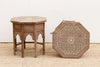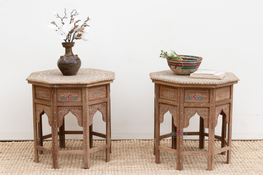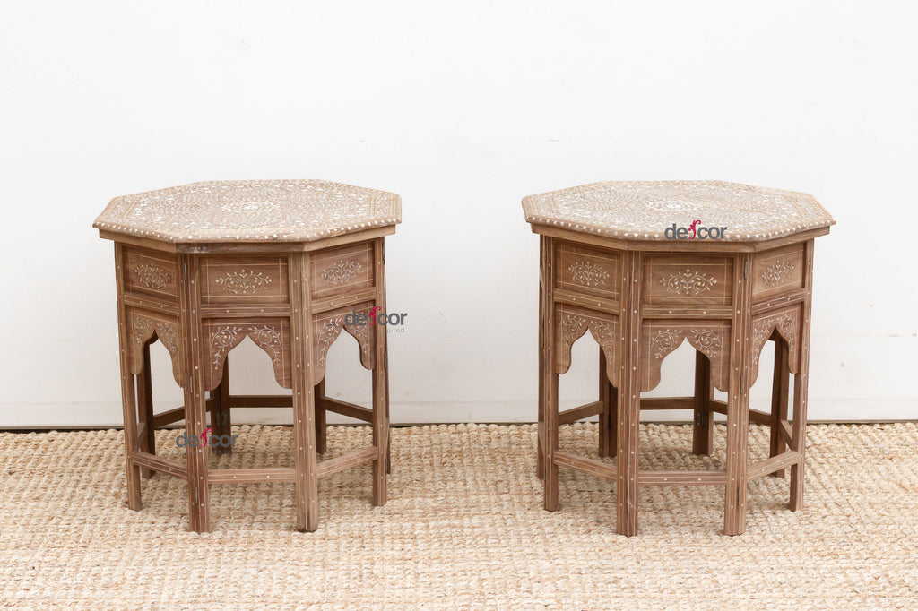 Introduce a touch of exotic elegance and intricate artistry, reminiscent of patterns found in sacred mandalas and royal floral motifs, with this pair of octagonal inlay tables. Each table, measuring 24 inches in width, depth, and height, showcases a beautiful inlay design across its top surface. The pattern often features a central focal point with radiating symmetry, echoing the spiritual significance of a mandala or the stylized beauty of royal floral emblems. The natural, unsealed finish highlights the raw beauty of the materials and the delicate craftsmanship of the inlay work.