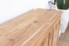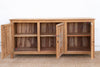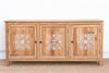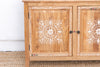 This magnificent sideboard is a beautiful fusion of clean, modern design and the raw, organic beauty of nature. Reconstructed from sturdy reclaimed teak and boasting a generous 72-inch long profile, this piece offers a substantial presence and a captivating aesthetic. Its enduring beauty is a testament to the artisan's skill in a centuries-old tradition: Damascene inlay. Each of the three doors is adorned with an elegant floral and leaf medallion, meticulously crafted from shimmering genuine sea mother-of-pearl. The natural bleached teak showcases a beautiful grain and texture, creating a stunning contrast with the luminous inlay. Featuring intricate inlay doors with simple iron ring handles and resting on sleek legs, this sideboard offers both functionality and captivating beauty.
