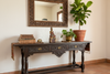 A soulful piece of devotional art, this hand-carved wooden figure depicts the Buddha seated in the Bhumisparsha mudra on a high, block-form throne. The statue features a traditional "Rouge & Gold" finish: a layer of auspicious red lacquer was originally applied to seal the wood, followed by gold leaf or paint. Decades of handling and time have worn the gold down, allowing the warm red under-layer and the raw wood to peek through. The result is a rich, textured surface that glows with history. The high, simple plinth and the pointed finial are characteristic of regional styles from Burma. It pairs beautifully with natural textures like linen, woven grass, or unpolished stone, making it a perfect centerpiece for a mindful entry table or meditation space.