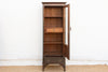 This 70-inch tall cabinet is a commanding example of British Colonial design. Crafted from solid teak with a deep, dark espresso-toned patina, it features a unique "split-display" design. The upper section consists of a large glass-front door that reveals a central storage drawer—an unusual and highly functional interior detail. Below the glass, a solid wood recessed panel is anchored by a bottom utility drawer with original brass hardware and an elegant bracket-style base. In the late 19th and early 20th centuries, these tall, narrow "gentleman’s cabinets" were designed for multifunctional use in colonial estates, often serving as a secure place for a mix of documents, valuables, and textiles. The inclusion of an internal drawer behind a locked glass door was a hallmark of security-minded craftsmanship, ensuring that even while items were on display, the most precious contents remained tucked away.