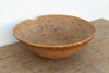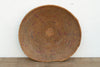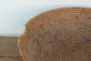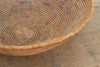 At a sprawling 27 inches wide, this oversized nomadic winnowing bowl is a spectacular piece of functional tribal art. In traditional agrarian communities, shallow, wide baskets of this monumental scale were essential tools during the busy harvest season. They were relied upon constantly by artisans and farmers for winnowing large quantities of grain, sorting communal crop yields, and transporting dry goods. Woven entirely by hand from thick, locally sourced natural grasses and reeds, this bowl features beautifully tight, concentric coiling. The artisan skillfully incorporated faded red, pink, and purple dyed fibers directly into the weave, creating a striking, repetitive geometric pattern that radiates from the center base all the way up the sides. The rim was left wonderfully raw and unadorned, showcasing the natural fraying and authentic wear of a true historic artifact.