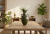 A striking piece of Provencal history, this tall earthenware jar was originally utilitarian, designed to store precious olive oil or water in a cool cellar. It is defined by its elegant amphora shape, sturdy twin handles, and incredible glaze—a deep, lustrous forest green that varies in intensity across the surface. The glaze stops just short of the rim and base, revealing the raw terracotta clay underneath, a hallmark of authentic rustic pottery. It will look incredible perched on a large kitchen island or a deep sideboard, where its glossy green surface adds a splash of sophisticated color to neutral interiors.