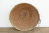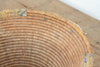 This beautifully worn nomadic harvest bowl is a prime example of rural resourcefulness. In traditional agrarian communities, mid-to-large baskets like this were essential everyday tools relied upon constantly for gathering and winnowing crops. To extend the life of these vital household items, artisans would painstakingly patch and reinforce them using whatever materials were available, resulting in one-of-a-kind, deeply personal artifacts. Hand-woven from natural grasses and reeds, this bowl features beautifully tight, repetitive concentric coiling. The absolute standout feature is the incredibly authentic, distressed textile work along the rim. The edge is bound with a faded, patterned fabric, while a heavily torn, repurposed blue and white striped textile hangs organically from the side. The raw fraying of both the natural grasses and the repurposed fabrics tells the true story of its long history of heavy utility.