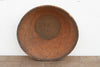 This 24-inch nomadic winnowing bowl is a beautiful study in cultural adaptation and functional longevity. Originally hand-woven as an essential tool for agrarian life, baskets of this scale were the lifelines of the home—used daily for gathering crops, winnowing grains, and storing communal food supplies. This particular piece showcases a unique bridge between ancient techniques and the resourceful use of modern materials found in later 20th-century tribal wares. Hand-crafted from tightly coiled natural grasses, this vessel features a prominent, sun-baked earthen mud seal across its exterior base. This traditional method was used to waterproof the bottom and prevent precious seeds from escaping the weave. To reinforce the rim against heavy use, the artisan resourcefully bound it with a repurposed textile featuring a vibrant red and blue geometric pattern, adding a distinct layer of eclectic character to the primitive form.