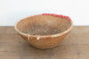 This beautifully preserved nomadic harvest bowl is a classic example of everyday tribal craftsmanship. Originally woven as an essential agricultural tool, baskets of this manageable 18-inch scale were relied upon heavily for gathering small crops, winnowing grains, or sorting seeds during the busy harvest season. Hand-coiled from sturdy natural grasses and reeds, this bowl features a wonderfully tight, repetitive weave. Its standout feature is the beautifully distressed textile binding wrapped tightly around the rim. The artisan resourcefully used a mix of plain white fabric and a faded red textile featuring a white geometric pattern to reinforce the edge against daily friction. The frayed strings hanging from the fabric wrap add a perfect touch of raw, unstudied character.