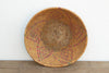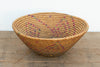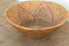This vibrant, mid-sized nomadic harvest bowl perfectly captures the intersection of daily utility and tribal artistry. In traditional agrarian societies, wide, shallow baskets of this scale were essential, hardworking tools used for gathering crops, winnowing grains, or serving food. Crafted entirely by hand, each piece carries the unique creative signature of the artisan who wove it. This particular bowl stands out because the weaver incorporated beautifully faded pink, red, and green dyed fibers directly into the coils, creating a striking, repetitive geometric pattern that cascades down the sides. When you flip the basket over, you will also find a thick patch of original, sun-baked earthen mud sealing applied to the center of the base. This brilliant historical technique was used to protect the bottom of the basket from damp ground and prevent fine grains from falling through the woven cracks.