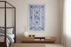 This large vibrant Suzani tapestry was handcrafted in Uzbekistan. The soft, off-white cotton background provides a canvas for a captivating display of hand-embroidered floral motifs. Lush blue thread brings the design to life, with delicate light blue accents adding depth to the leaves. This meticulous needlework showcases the artistry and skill passed down through generations of Suzani artisans. More than just a decorative piece, this vintage Suzani tapestry is a conversation starter. Hang it on a wall for a captivating focal point that sparks curiosity about global cultures. Drape it over your sofa or bed to add a touch of exotic elegance and infuse your space with a unique blend of warmth and cultural heritage.