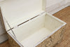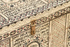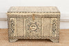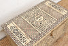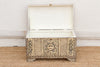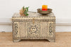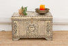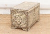 This hand-painted vintage chest is a storybook painted on wood. Sourced from the villages of India, these Vintage Folk Art Trunks (known as Pitara) were traditionally used to store quilts, heirlooms, and bridal dowries. Each one is a unique canvas, hand-painted by village artisans in a naive, expressive style that captures the joy and symbolism of daily life. Perfectly sized at 29" x 16" x 18"H, this vintage trunk is compact enough to fit anywhere while offering deep, practical storage. The construction is solid wood, reinforced with metal strapping and latches, but the charm lies in the patina. The paint has aged beautifully, softening into a matte, time-worn finish that feels authentic and grounded.