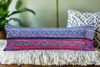 Magnificent long lumbar pillow made from a wonderful batik fabric. This pillow has a striped rich indigo textile front with a fuchsia trim and geometric designs. The backing is solid fine ivory linen and comes with a down blend pillow insert.