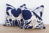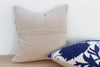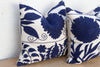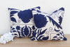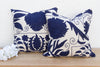 This magnificent pair of decorative pillows is a true artifact of Central Asian artistry. Each square pillow is crafted from genuine Vintage Suzani textile, a prestigious embroidered cloth originating from Uzbekistan and the surrounding regions of the Silk Road. The design is defined by dense, intricate hand embroidery in deep indigo blue thread on a natural ground, featuring powerful, stylized floral and vine motifs that often symbolize fertility, health, and abundance. This meticulous hand-stitched art bears the authentic charm and minor wear of its age, transforming the textile into a unique heirloom.