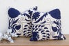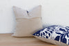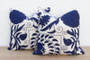 This magnificent pair of decorative pillows is a true artifact of Central Asian artistry. Each square pillow is crafted from genuine Vintage Suzani textile, a prestigious embroidered cloth originating from Uzbekistan and the surrounding regions of the Silk Road. The design is defined by dense, intricate hand embroidery in deep indigo blue thread on a natural ground, featuring powerful, stylized floral and vine motifs that often symbolize fertility, health, and abundance. This meticulous hand-stitched art bears the authentic charm and minor wear of its age, transforming the textile into a unique heirloom.