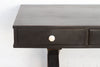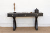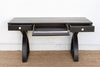 This writing table is a masterclass in modern, architectural design, a stunning study in dramatic contrast and balance. Measuring a generous 60 inches long, this writing table is a blend of Contemporary design and inspiring workmanship inspired by . The graceful, sculptural crossed-leg base provides a powerful, fluid counterpoint to the clean, rectilinear top, which features three functional drawers. The entire piece is finished in a rich, sophisticated ebonized black, with contrasting white knobs that add a final, striking touch. Originally designed as a functional writing desk, its elegant and substantial form makes it equally perfect for a modern home as a commanding console table in an entryway or a minimalist vanity in a bedroom.