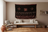 This fabulous antique Kohistani shawl whispers stories of the Mangal people, inhabiting the borderlands of eastern Afghanistan and western Pakistan. This antique shawl was Traditionally worn by women as a head covering during wedding or ceremonies, this piece is a testament to the Mangal's artistry and cultural heritage. Hand-crafted from heavy black cotton, the shawl is adorned with intricate silk embroidery. Geometric and floral motifs in vibrant colors like red, green and yellow dance across the surface, reflecting influences from neighboring cultures while retaining a distinct Mangal identity. Shimmering glass beads and repurposed zipper parts add a touch of individuality and resourcefulness, a hallmark of nomadic life.
