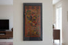 Immerse yourself in the rich spiritual and artistic heritage of Tibet with this framed antique Thangka painting. Measuring 27 inches wide and 54 inches high, this striking piece offers a glimpse into the intricate iconography and devotional artistry of Tibetan Buddhism. The central figure dominates the composition, immediately capturing the viewer's attention. Based on its red color, fierce expression, and attributes this is likely a wrathful deity or protector. Such deities in Tibetan Buddhism are not evil but represent the active force of compassion in overcoming obstacles and negative energies. The color palette is vibrant and symbolic. Red, the dominant hue, often represents power, energy, or compassion. Other colors, such as gold (or yellow), blue, and green, are used to depict the deity's garments, ornaments, and surroundings, each carrying specific meanings within the Buddhist tradition. The artist's skillful use of color creates a dynamic and visually compelling image. The artistic style is characterized by precise lines, detailed rendering of the figures' attire and attributes, and a flattened perspective, typical of Thangka painting. The overall effect is both powerful and intricate, reflecting the meticulous craftsmanship involved in creating these devotional artworks. The aged appearance of the Thangka, with subtle signs of wear and discoloration, adds to its authenticity and historical significance. These imperfections are not flaws but rather evidence of its use in devotional practices and its journey through time.