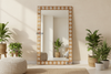 Showing clean contemporary lines contrasting with reclaimed teak and handmade inlay work. This beautiful boho modern mirror would be a staple in any home. Our blossom mother of pearl inlay collection is inspired by the opening of a lotus flower which is a symbol of purity and enlightenment. The reclaimed teak is hand-carved forming the flower shape, the inlay pieces are cut and carefully hammered into the wood to create the lovely lotus design.