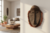 A striking piece of Oceanic tribal art, this large woven mask originates from the Sepik River region of Papua New Guinea, likely created by the Abelam people. Known as a "Yam Mask", it was traditionally crafted to decorate giant ceremonial yams during harvest festivals, transforming the tubers into living ancestral spirits. The mask is expertly woven from rattan in a tight, textural pattern and features a prominent, ridge-like nose and small, staring eyes. A fringe of dyed natural fibers frames the face in a rusty red hue, adding movement and contrast to the dark, smoked finish of the weaving. It looks incredible mounted on a clean white wall in a modernist hallway or living room.