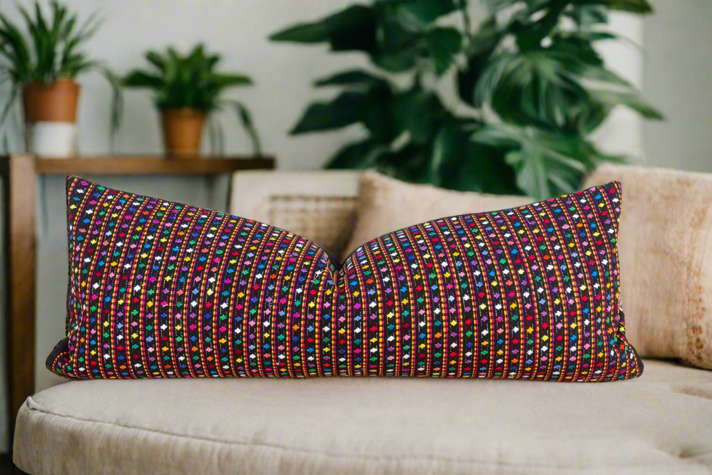 This one-of-a-kind lumbar pillow is made from a traditional Mayan textile. This vintage Huipil fabric was originally sourced in San Antonio, a village in the highlands of Guatemala. Like a traditional Mayan textile, this pillow is full of geometric shapes in alternating patterns. This Meso-American example has a black background with blue, pink, green, white and yellow brocade work in abstract designs. This Guatemalan pillow has a hidden zipper and oversize down blend insert.