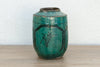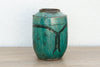 A vintage beautifully glazed porcelain vase with a flowers and birds design. This vintage Asian pottery piece has a cylindrical shape with a tapered neck. This lovely jar has a black and green glazed finish with normal chips and blemishes.