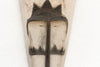 The mask's striking form is characterized by its elongated, tapering silhouette and a deeply carved, often heart-shaped concave face. This particular example showcases a beautiful, aged light finish, likely the remnants of traditional kaolin (white clay) application, a symbolic color associated with ancestors and the spirit world. The contrast between this pale face and the darker, more defined carved lines that delineate the eyes, long slender nose, and minimalist mouth adds to its enigmatic and serene yet imposing expression. What truly sets this mask apart is the distinctive crown-like element carved above the facial plane, lending the figure an air of regality and heightened spiritual authority.