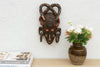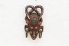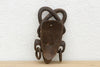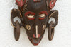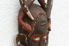 This striking mask, with its bold geometric patterns and avian-inspired design, speaks of a rich cultural heritage and artistic tradition. The weathered surface of the mask, likely carved from wood, displays a beautiful patina, suggesting age and ritual use. The contrasting colors, particularly the deep black, vibrant red, and earthy brown, create a visually compelling piece. Notice the intricate geometric patterns etched into the mask's surface, possibly representing scarification, clan markings, or symbolic elements. The prominent beak-like nose and the two figures perched atop the head, reminiscent of birds or other creatures, add a touch of zoomorphic symbolism and may represent power, protection, or spiritual connection.